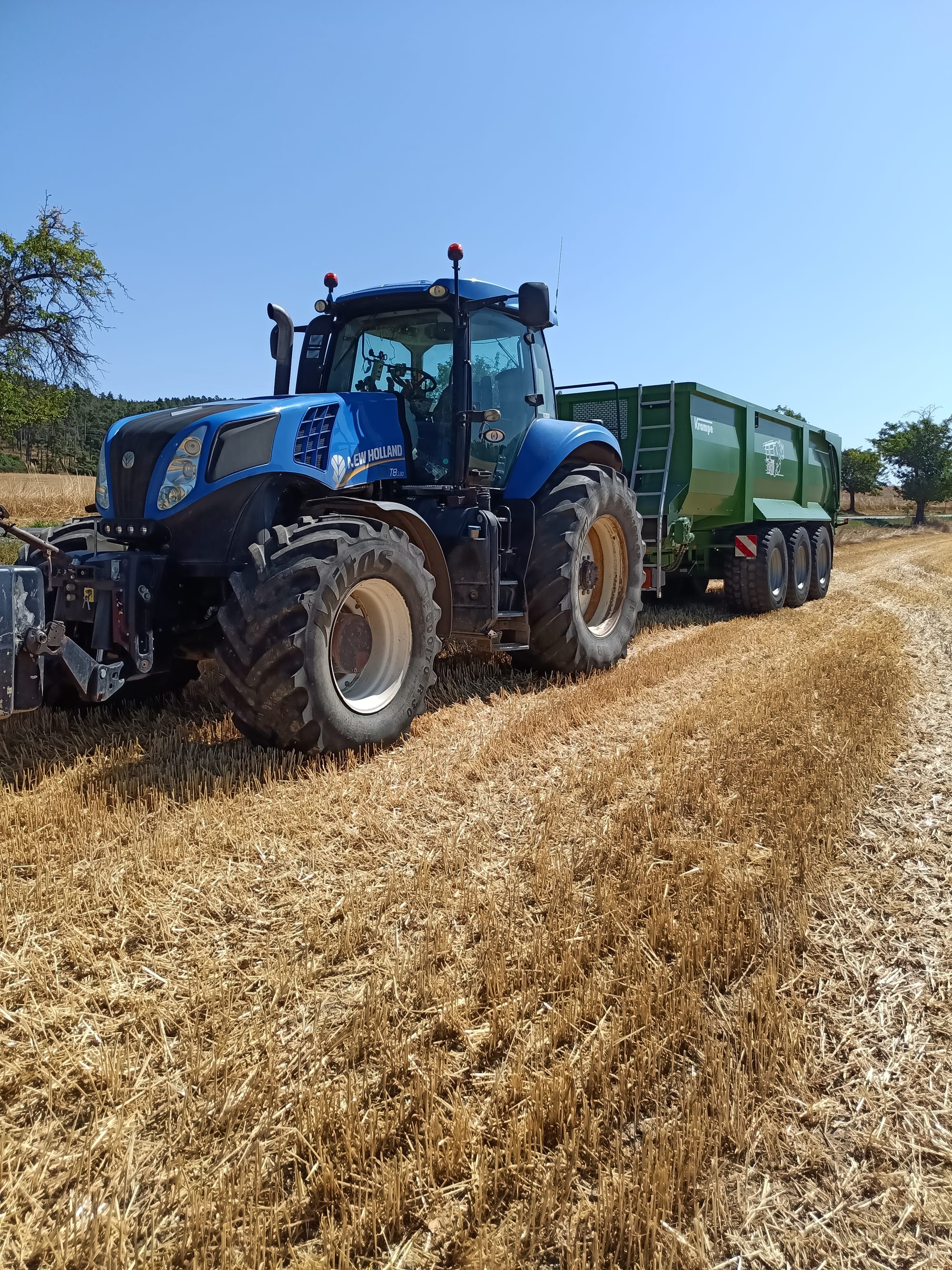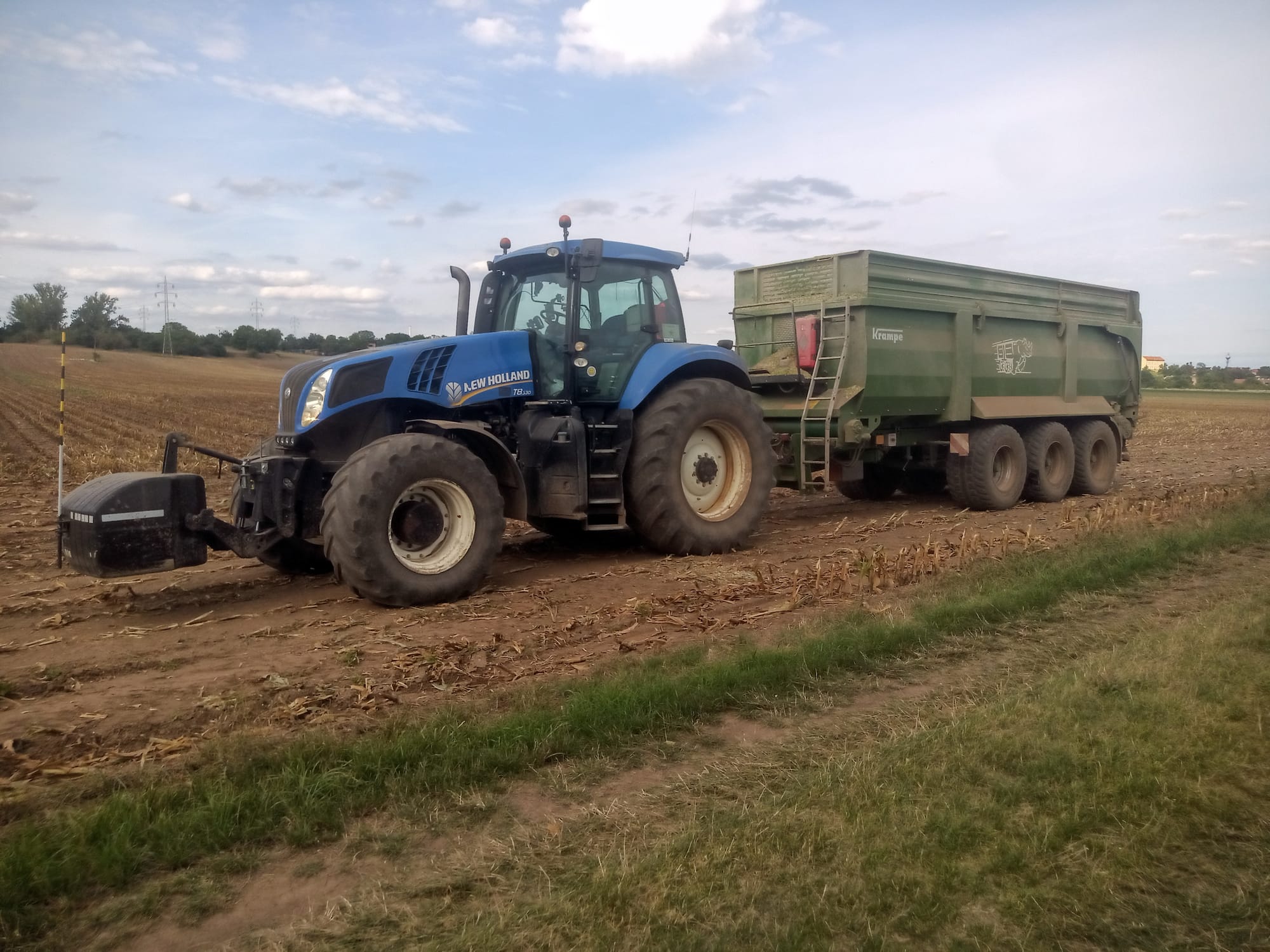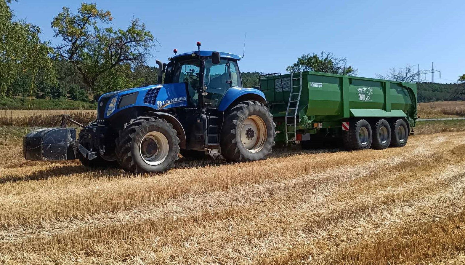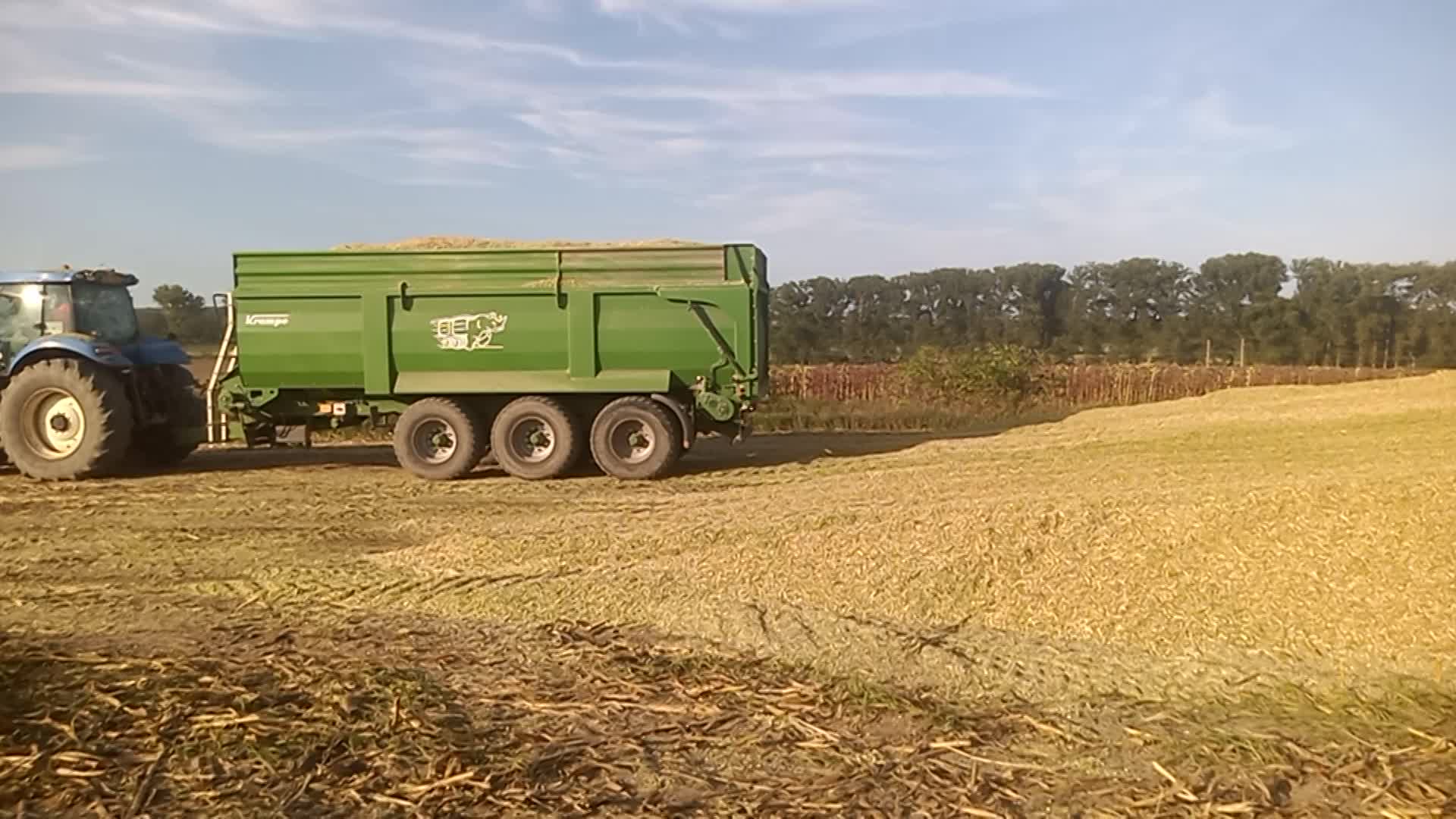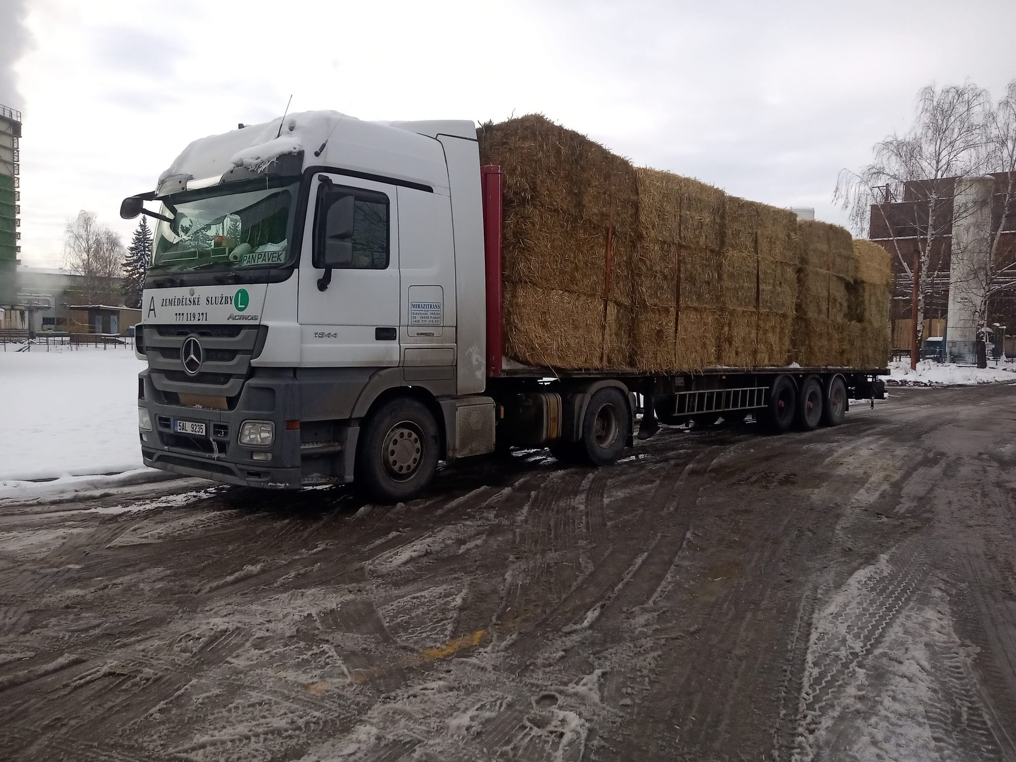 Poskytujeme traktorovou dopravu zemědělských produktů a komodit návěsem Krampe Bandit 900 o nosnosti 27t a objemu 45,8m3 s posuvnou podlahou, díky čemuž můžete počítat s rychlým a bezpečným převozem úrody a vykládku i v nízkých halách.